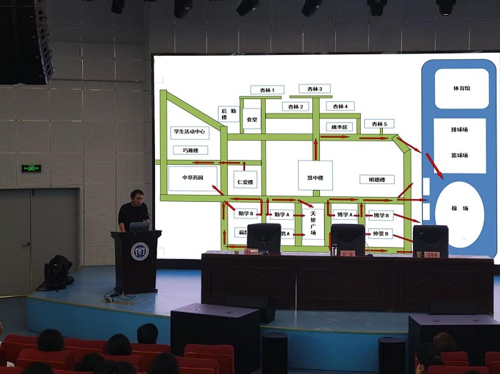 保卫科曹杰老师对学校应急疏散演练方案进行培训,介绍演练时间、地点和具体流程,包括预警信号的发布方式、各班级疏散的起始时间和顺序、集合地点等内容,确保参会人员清楚了解演练的每一个环节。详细解读了疏散路线,通过PPT课件展示校园平面图,标明各班级的疏散路线和关键点,强调疏散过程中的注意事项,如保持安静、弯腰低姿前行、避免拥挤推搡等。同时明确各岗位人员职责,如班主任负责组织本班学生疏散培训、任课教师协助维持秩序、后勤人员保障通道畅通、校医在集合地点待命提供医疗保障等,确保责任到人。